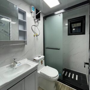 - Baño completo de lujo con inodoro, ducha completa, mueble lavamanos y botiquín con espejo.
